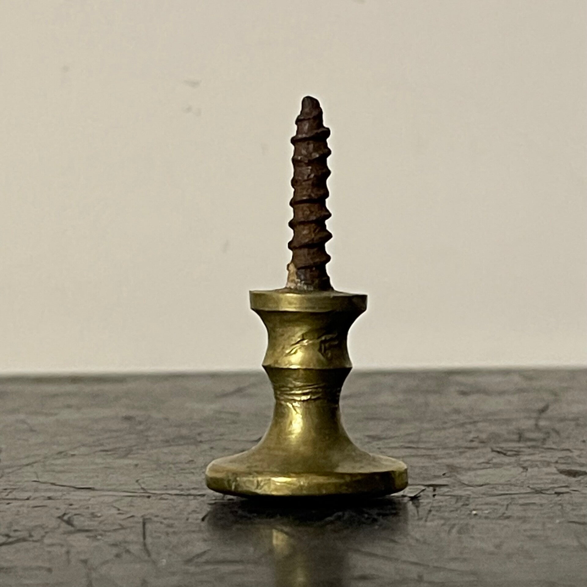 Een mooi eenvoudig koperen deur- of ladeknopje. Er zit een rand in die bestaat uit ieniemienie kleine krasjes.