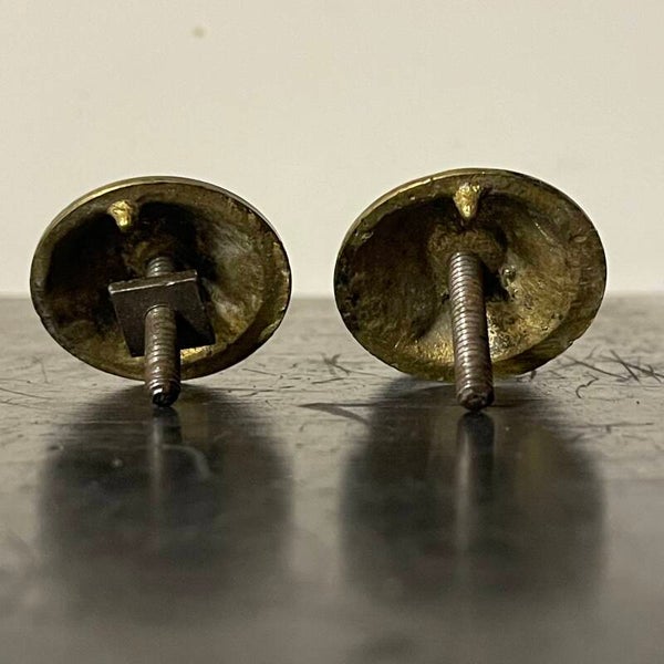 Stoere, koperen deur- of laden knoppen met het relief van een leeuw. 1 Knop heeft een ring door de neus. Bij de andere ontbreekt deze.