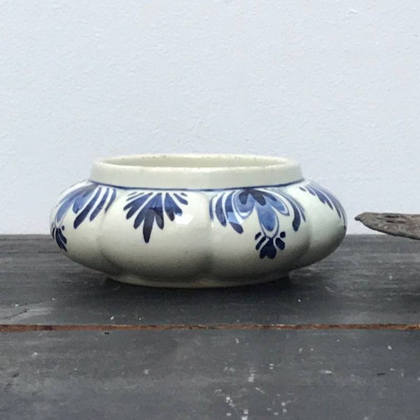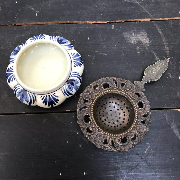 Een prachtig bewerkt zilveren theezeefje met een bijpassend DelftsBlauw lekbakje bewerkt met bloemen in mooie blauwe tinten.