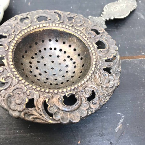 Het theezeefje is bewerkt met verschillende soorten bloemen. In het handvatje staan de letters AVRO.