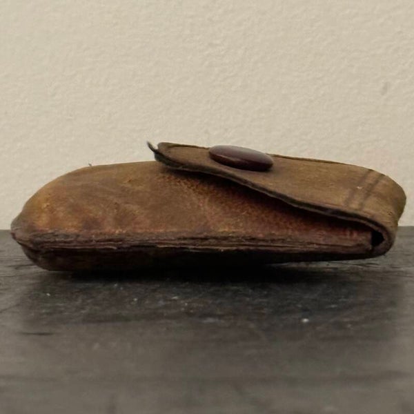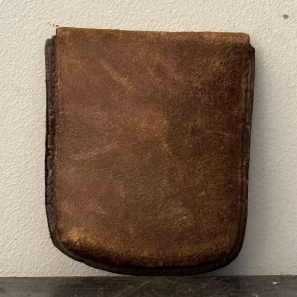 Een eenvoudig lichtbruin soepel lederen mapje voor een rozenkrans. De sluiting bevat een drukknopje wat nog prima werkt. Het mapje is mooi door zijn eenvoud.