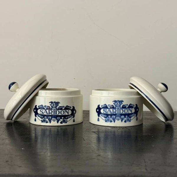 Een porseleine apothekers pot voor de vroeger welbekende pijnstiller Saridon. Ze zijn gemaakt door NV Plateel Bakkerij Schoonhoven Holland. Hij heeft het fabricagenummer 6164/11