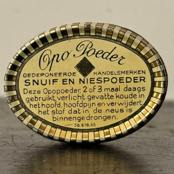 Een klein blikje gevuld met Poudre Opo, Snuif- en neispoeder. Poudre catarrhale, Marques Déposées. van het merk L.I. Akker