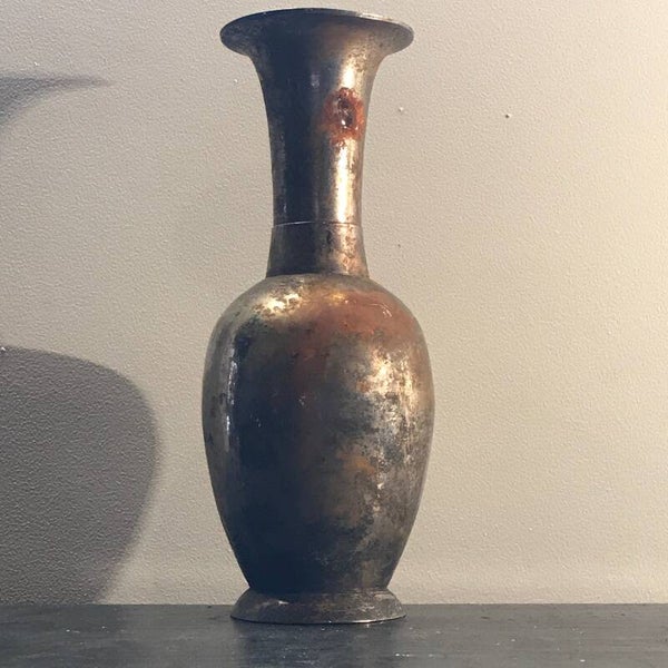 Een zeer MooiOud vaasje van ijzer. De kleurvarianten op het ijzer maken dit vaasje erg apart. Een kant van de vaas is nog niet heel erg aangetast, daartegen is de andere kant flink geroest.