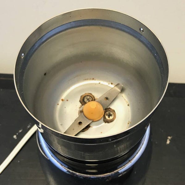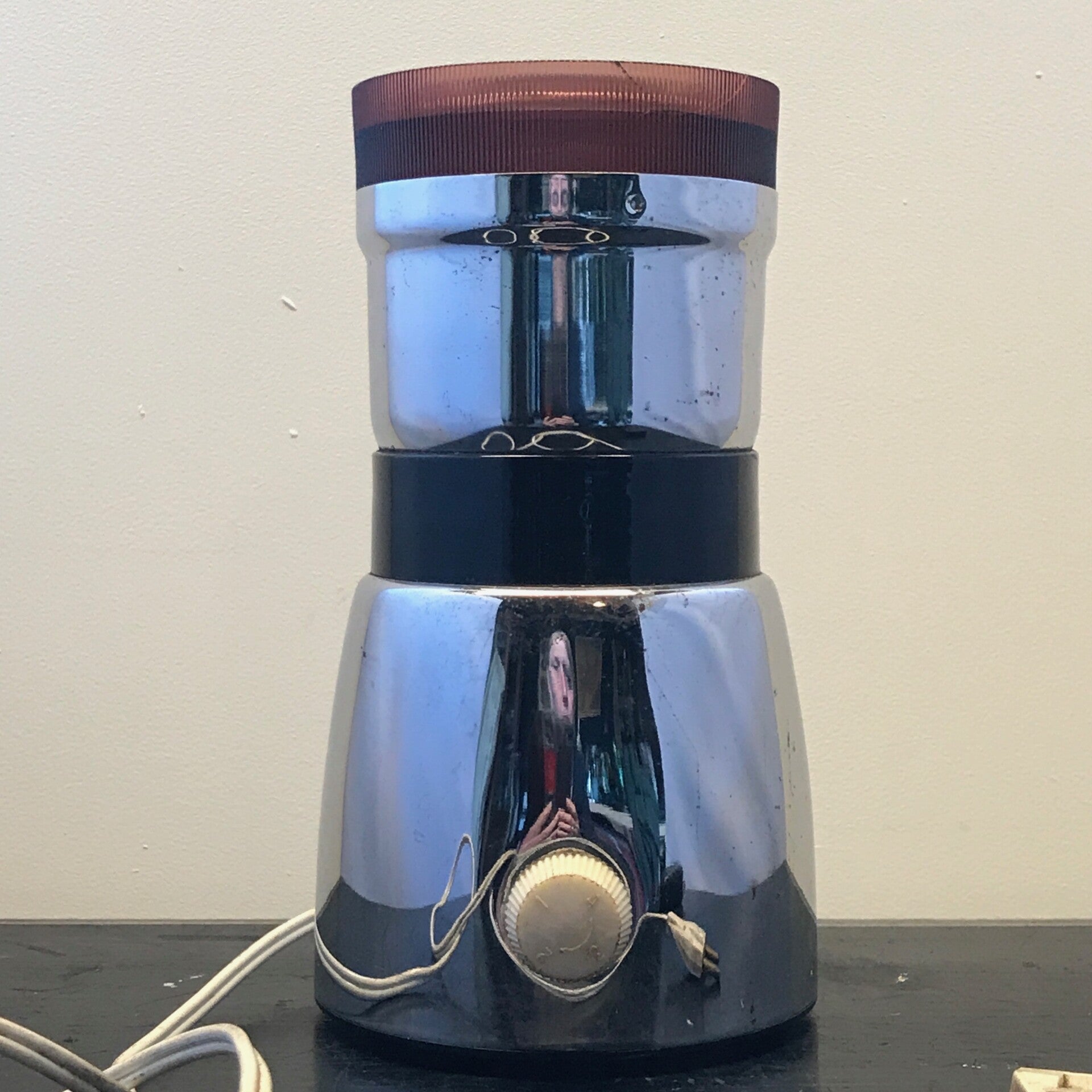 Een leuke elektrische koffiemolen van RVS en een bruine doorzichtige deksel.