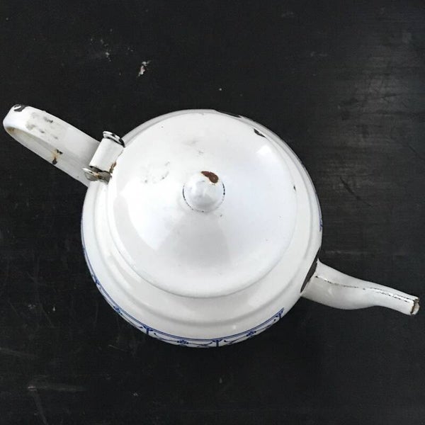 Een lief theepotje van wit emaille "Saksisch Blauw"