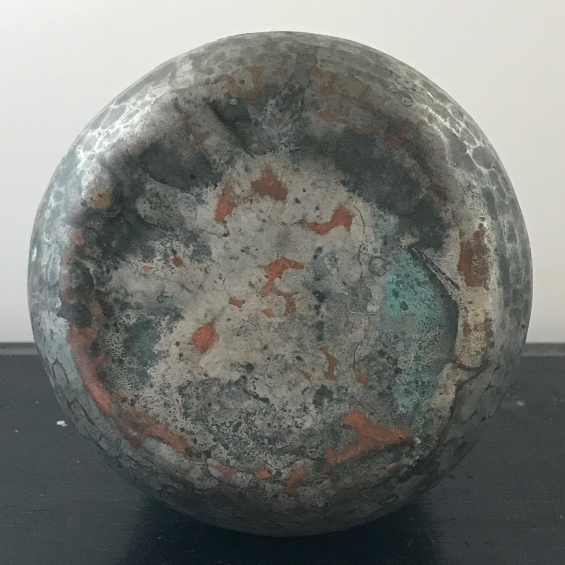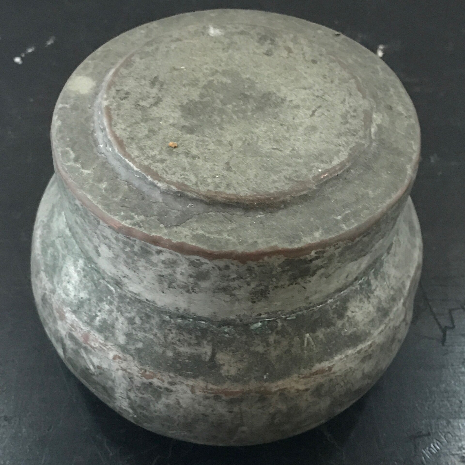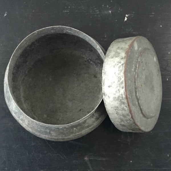 Een zeer eenvoudige pot met deksel maar erg mooi door de kleuren en zijn vorm. Hij is van gemoffeld ijzer en van stevige kwaliteit.