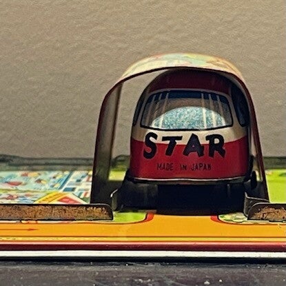 Een superleuk blikken baan met daarop een tunnetje. Als je het autootje opwindt rijdt ie over de baan langs een soort railsysteem door het tunneltje.