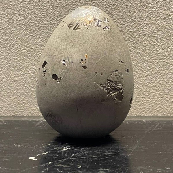 Gegoten eieren van beton met daarin vlokken in de kleuren Zilver, Goud, Roségoud en alleen beton.