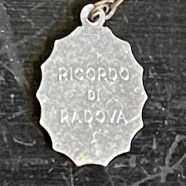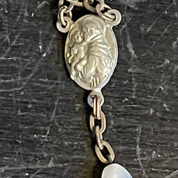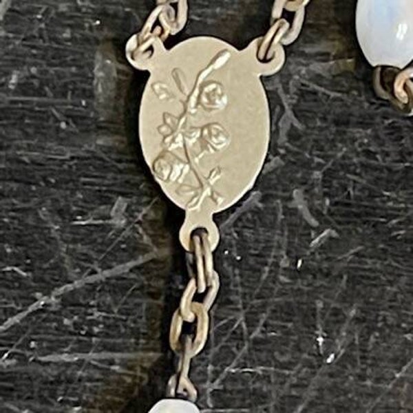 Een heel aparte, korte rozenkrans met parelmoer witte kralen en in plaats van een kruis een groen geëmaillerde bedel.