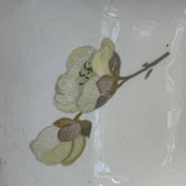 Een mooie, eenvoudig beschilderde, ovale schaal met daarop mooie bloesem in de kleuren oranje, blauw en grijs.