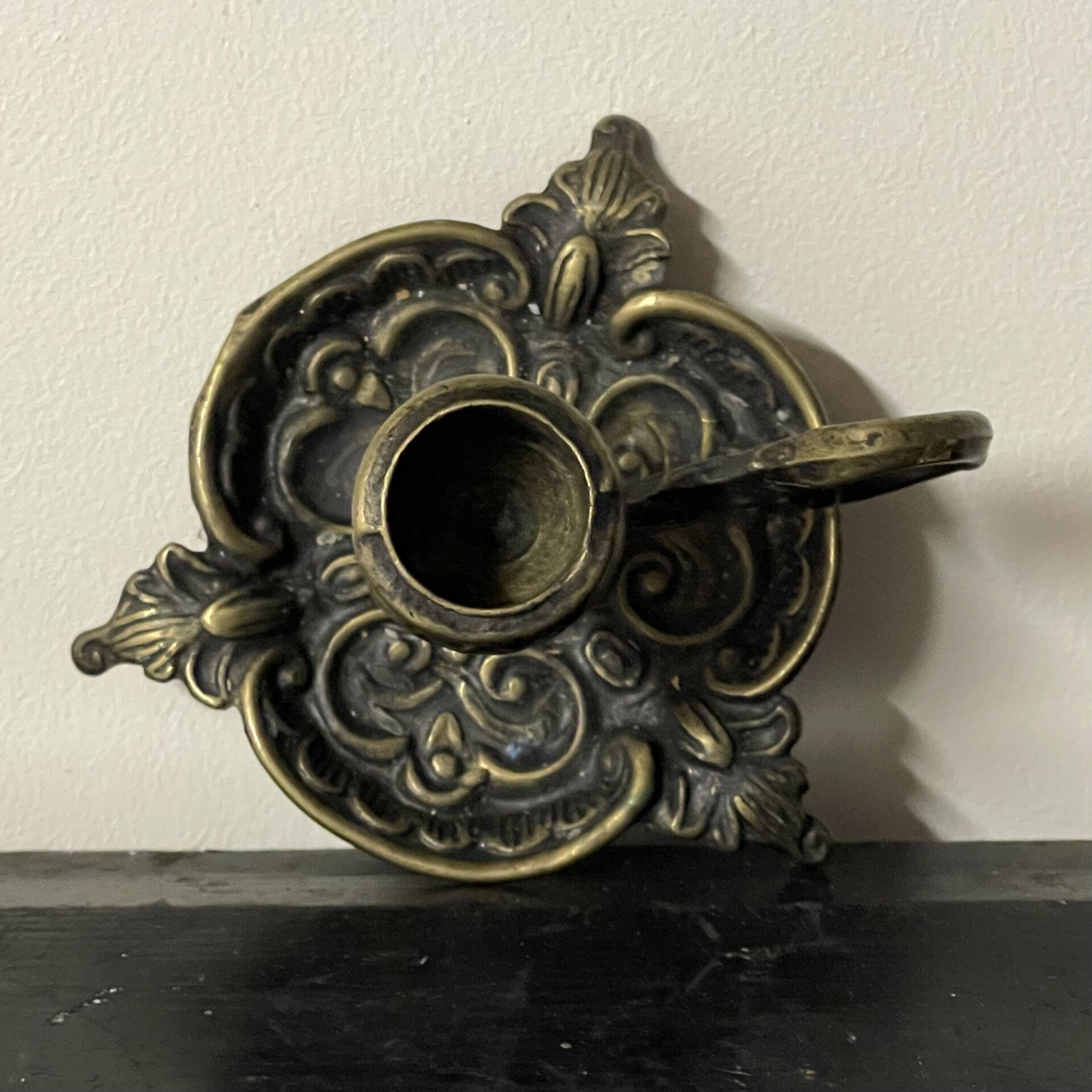 Een sierlijk bewerkte koperkleurige kandelaar.