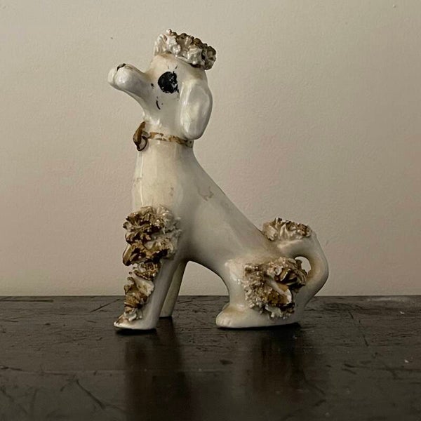 Een allerliefst MooiOud beeldje van een poedel. Hij is wit met zwarte en goudkleurige details.