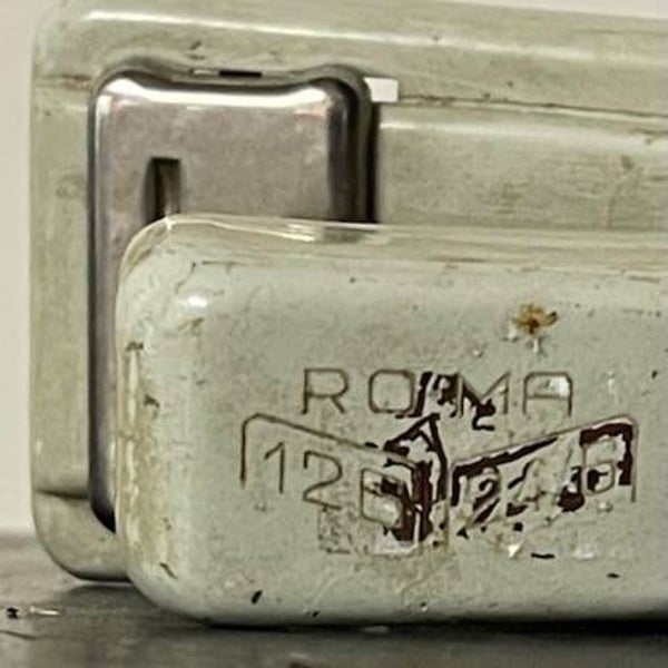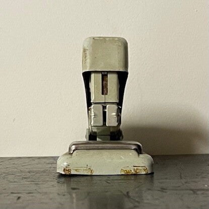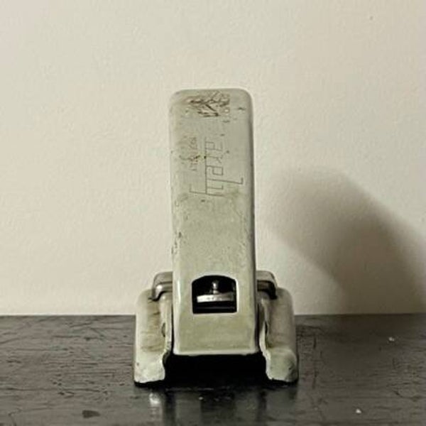Een leuke kleine grijze nietmachine. Het is in de jaren 1950-1960 gemaakt op Italiaanse bodem.