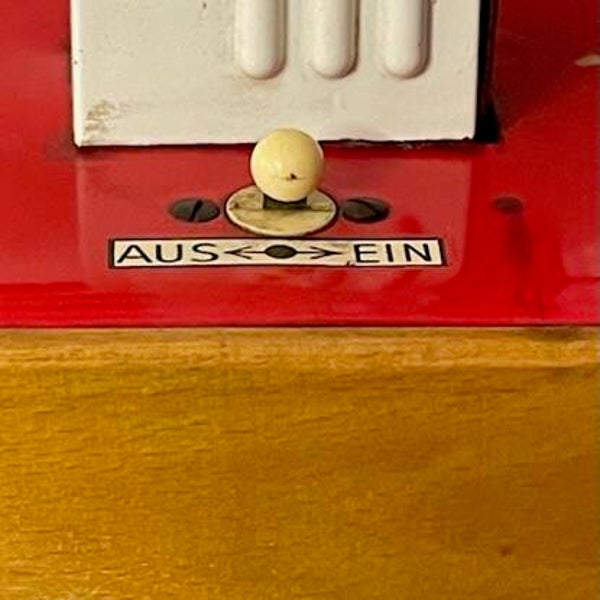 Een MooiOud kinder naaimachientje van het merk Regina. Het naaimachientje zelf is wit, de plaat waar het op vastzit is rood ijzer en het geheel staat op een open houten blok. Aan de onderkant is een uitsparing om batterijen te plaatsen.